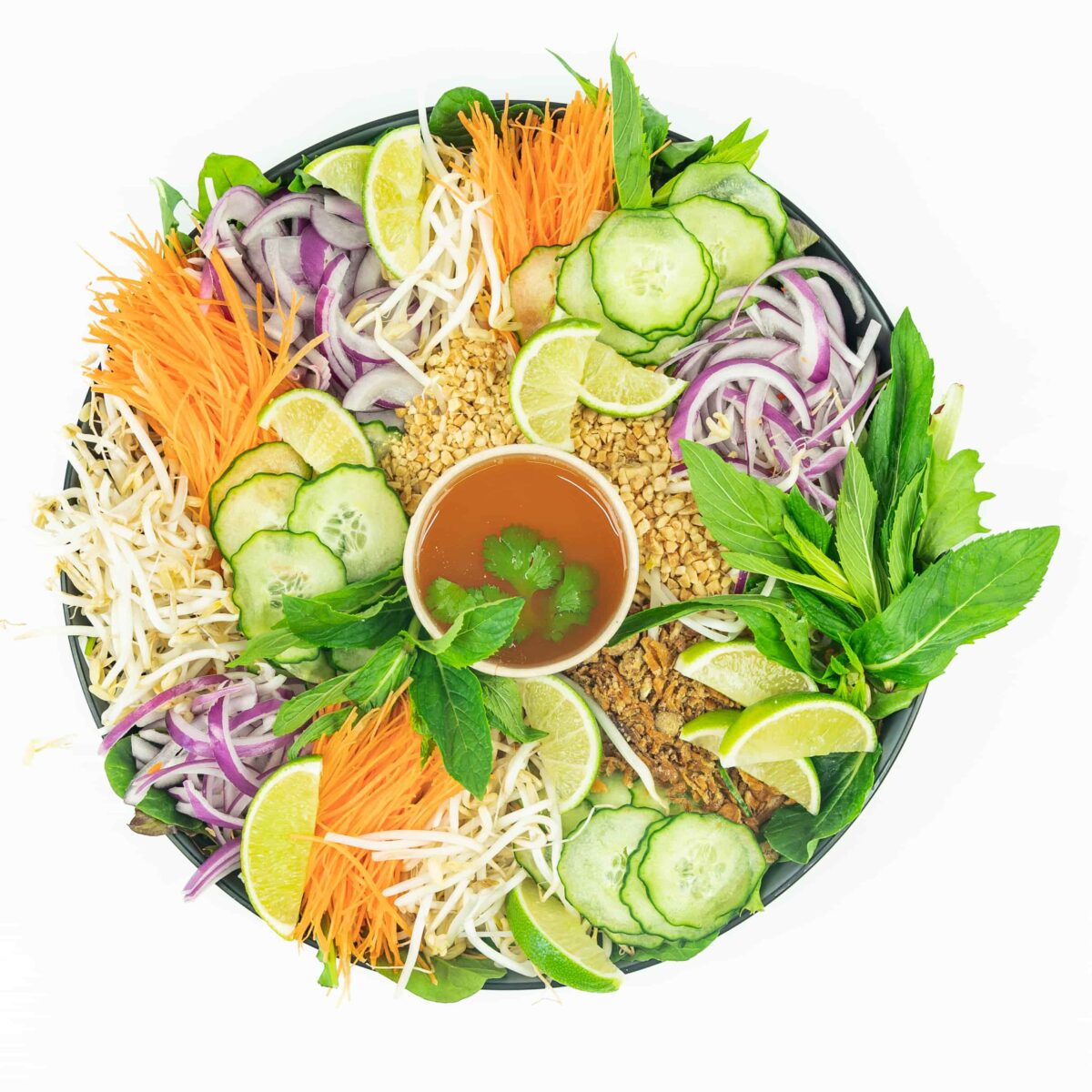 If you’re looking for something light and refreshing, this one’s a winner. A mix of rice noodles, cucumber, carrot, onion, bean shoots and topped with fragrant mint, a squeeze of fresh lime, and crispy shallots—this salad is full of texture and fresh flavours. The zesty vegan Nam Jim dressing adds the perfect balance of sweet, sour, and savoury. Ideal for any event in need of a refreshing, health-conscious option.