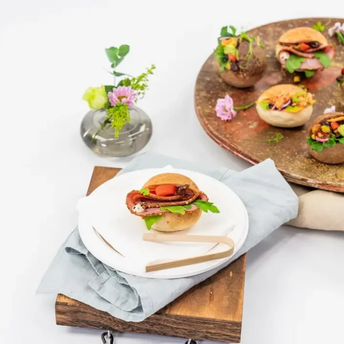 Duo Pack – Peppered beef slider, caramalised onion jam, roasted red peppers, rocket, horseradish dressing